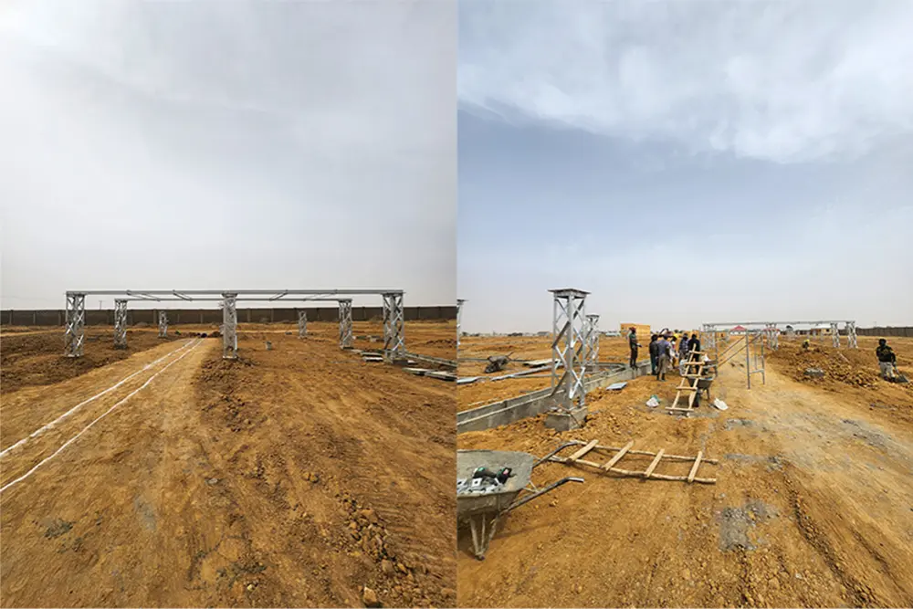 Mesmo com a temperatura local atingindo 35,6 graus Celsius, a tripulação se move rapidamente. Os componentes de aço galvanizado estão agora no solo e prontos para serem colocados. Essas estruturas são construídas para atender às altas demandas de uma subestação de 330kV e garantir estabilidade de longo prazo para a rede elétrica local.